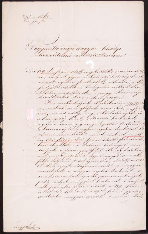 1868 Kraszna megye bizottmányának levele a Honvédelmi minisztériumnak, melyben sérelmezik, hogy nem használhatnak a katonai levelezésben magyar nyelvet amíg erre nincs megegyezés, és jelzik, hogy továbbra is a magyart fogják használni , ha nem kapnak hiteles fordítót