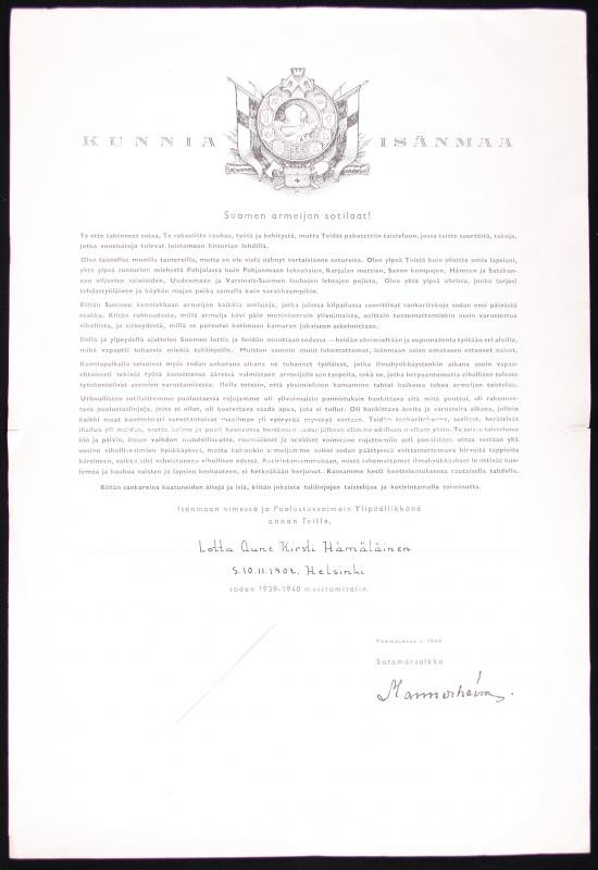 1940 Honour, Fatherland Finnish-Russian war awarding document for soldier