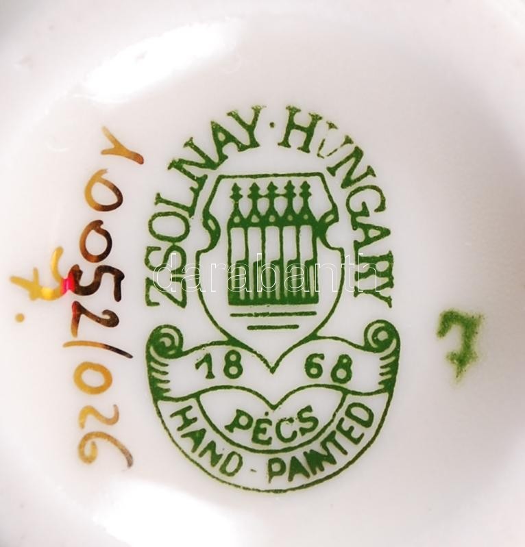 Kézzel festett Zsolnay mini váza, jelzett, hibátlan / Hand painted Zso... https://www.darabanth.com/de/189-Fernauktion/189.0/Andere-Sammelgebiete/Porzellan~2000043/Kezzel-festett-Zsolnay-mini-vaza-jelzett-hibatlan-Hand-painted-Zsolnay-vase-m8-cm~II709927