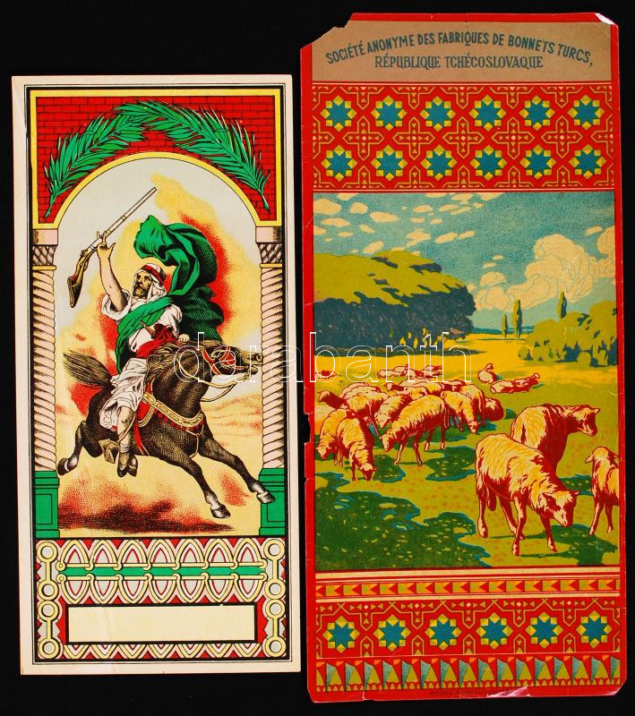 Beschreibung: cca 1910-1920, 2 db Fez címke: arab lovas ,litográfia, 22x10,5cm + Csehszlovák birkák, apró szakadások 26x12,3cm