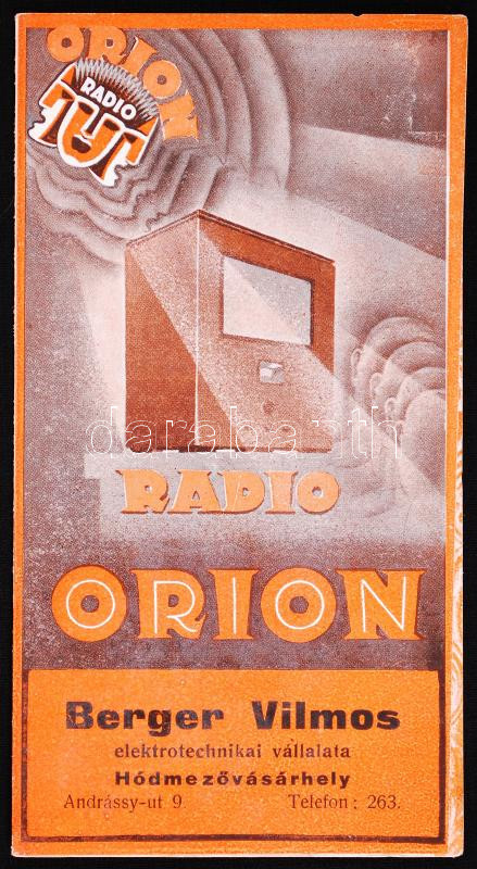 cca 1930 Radio-Orion - Berger Vilmos elektrotechnikai Vállalata, Hódme... https://www.darabanth.com/de/189-Fernauktion/189.0/Andere-Sammelgebiete/Werbungen~4000018/cca-1930-Radio-Orion--Berger-Vilmos-elektrotechnikai-Vallalata-Hodmezovasarhely-Kihajthato-~II709574