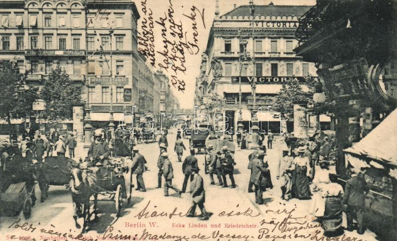 Beschreibung: Berlin, Ecke Linden un Friedrichstrasse / street corner, Hotel Victoria