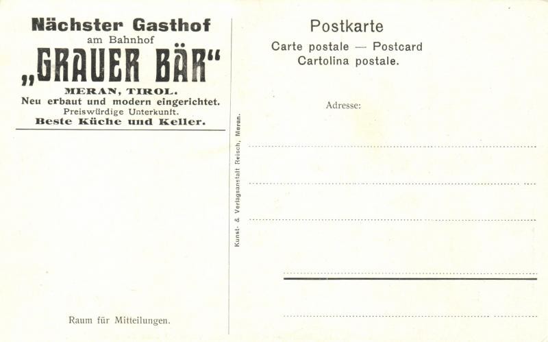 Meran, Merano; Gasthof Grauer Bär, Kunst und Verlagsanstalt Reisch / h... https://www.darabanth.com/de/19-Gross-Auktion/19.1/Ansichtskarten-Ausland/Italien~6625/Meran-Merano-Gasthof-Grauer-Bar-Kunst-und-Verlagsanstalt-Reisch-hotel-s-Reisch~II941260