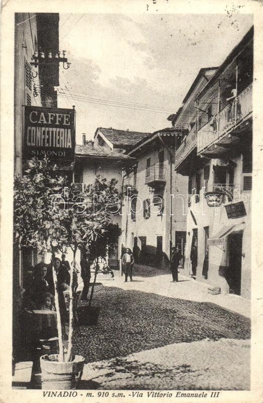 Vinadio, Via Vittorio Emanuele III, Café Simondi https://www.darabanth.com/de/19-Gross-Auktion/19.1/Ansichtskarten-Ausland/Italien~6625/Vinadio-Via-Vittorio-Emanuele-III-Cafe-Simondi~II914195