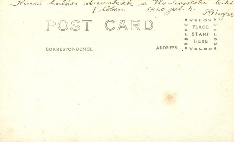 1920 Vladivostok, Chinese fishermen in the port, photo https://www.darabanth.com/de/19-Gross-Auktion/19.1/Ansichtskarten-Ausland/RuC39Fland~6626/1920-Vladivostok-Chinese-fishermen-in-the-port-photo~II917638