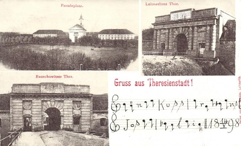 1898 Terezín, Theresienstadt; Paradeplatz, Leitmeritzer Thor, Bauschow... https://www.darabanth.com/de/19-Gross-Auktion/19.1/Ansichtskarten-Ausland/Tschechische-Republik~6575/1898-Terezin-Theresienstadt-Paradeplatz-Leitmeritzer-Thor-Bauschowitzer-Thor-Litomericka-bran~II923259
