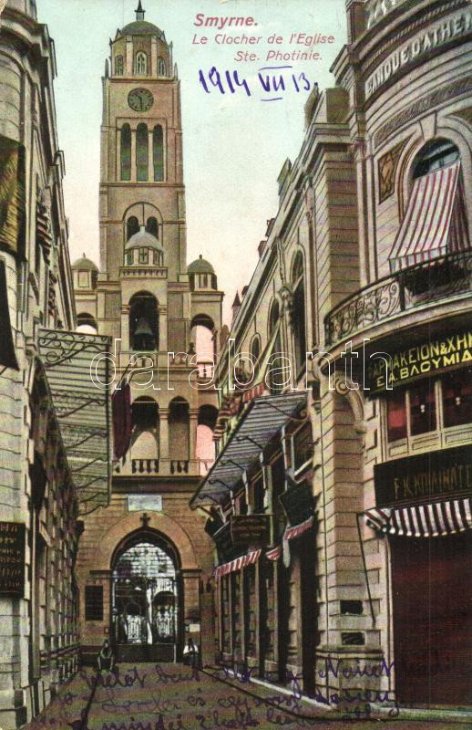 Smyrna, Le Clocher de l'Eglise Ste. Photinie / church, shop https://www.darabanth.com/de/19-Gross-Auktion/19.1/Ansichtskarten-Ausland/Turkei~6639/Smyrna-Le-Clocher-de-lEglise-Ste-Photinie-church-shop~II905699