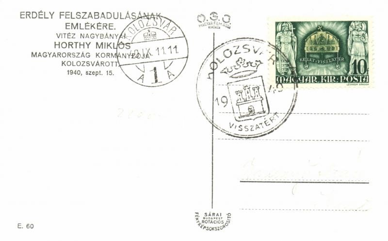 Beschreibung: 1940 Kolozsvár, Horthy, Purgly Magdolna, bevonulás / entry of the Hungarian troops 'vissza' So. Stpl