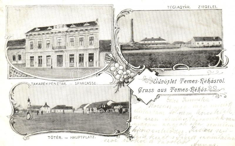 Beschreibung: Temesrékás, Takarékpénztár, Főtér, téglagyár / bank, main square, brick factory; floral