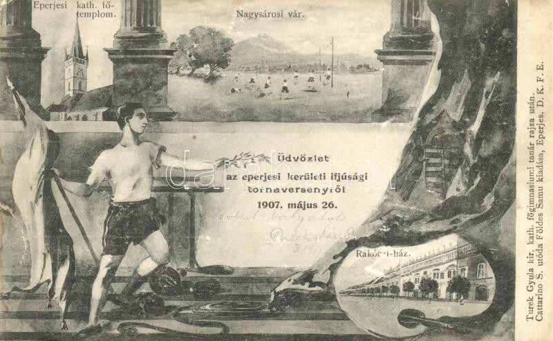 Beschreibung: 1907 Eperjes, Kerületi ifjúsági tornaverseny, Turek Gyula főgimnáziumi tanár rajza után; Földes Samu kiadása / youth sport championship (fl)