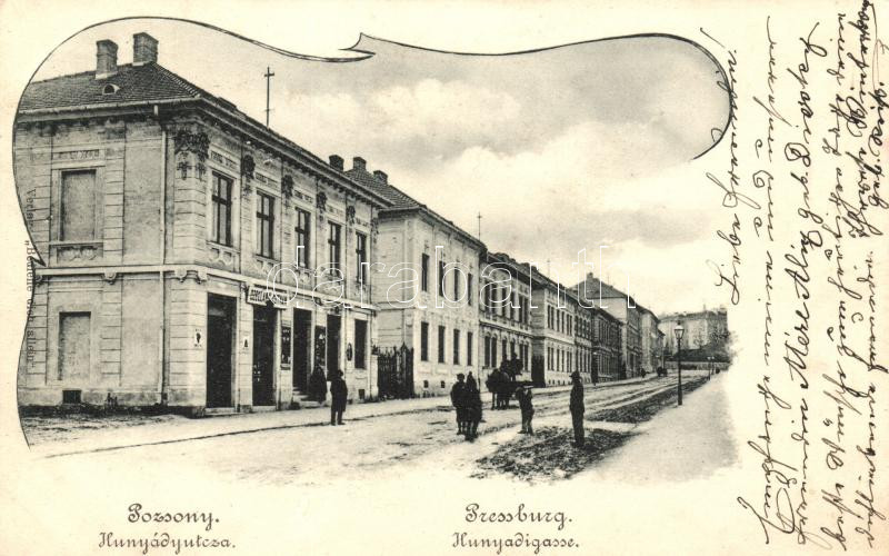 Beschreibung: Pozsony, Pressburg; Hunyadi utca, üzlet / street, Verlag 'Bediene dich allein'