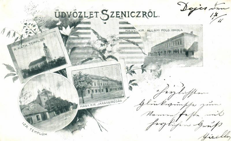 Beschreibung: Szenice, Szenicz; Izraelita templom, járásbíróság / synangogue, court; floral