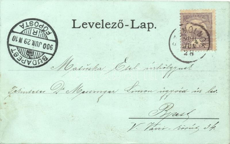 Beschreibung: Szomolnok, Dohánygyár, Pécs-akna, Uhornai-tó / tobacco factory, mine; floral, kiadja J. Ritter