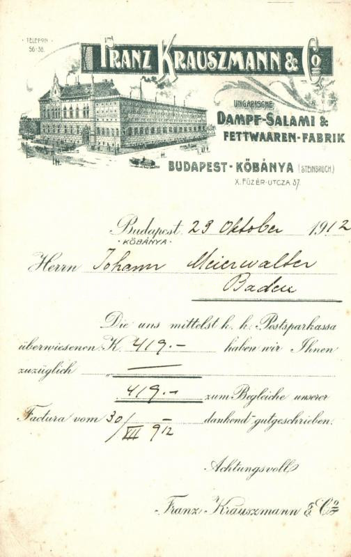 Budapest X. Kőbánya, Krauszmann Ferenc és társa szalámigyára; Füzér ut... https://www.darabanth.com/de/19-Gross-Auktion/19.1/Ansichtskarten-Ungarn/Ungarn~6543/Budapest-X-Kobanya-Krauszmann-Ferenc-es-tarsa-szalamigyara-Fuzer-utca-37~II931898