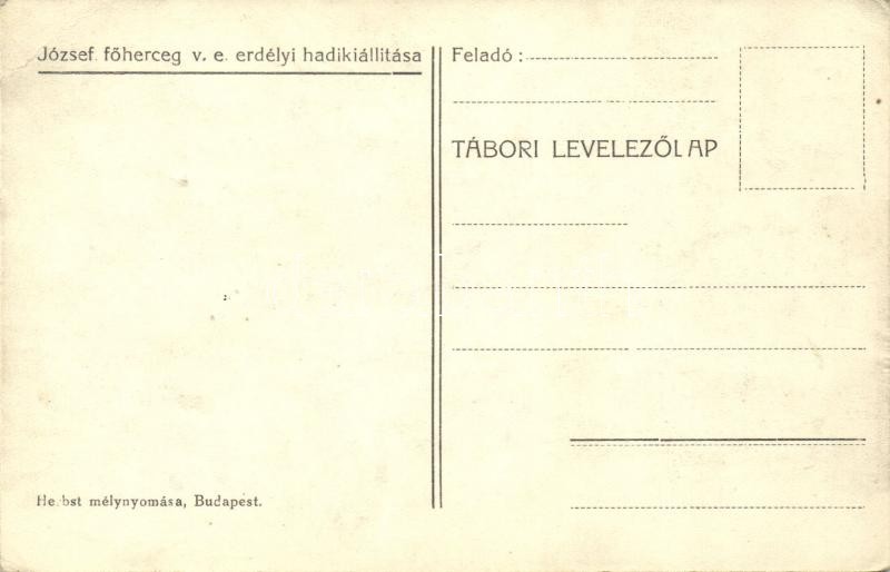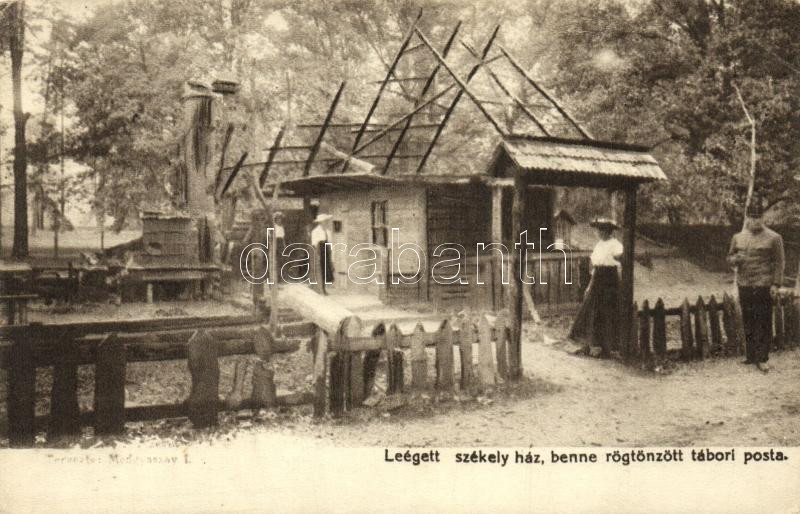 Beschreibung: Budapest XIII. Margitsziget; leégett székely ház, benne rögtönzött tábori posta; József főherceg erdélyi hadikiállítása