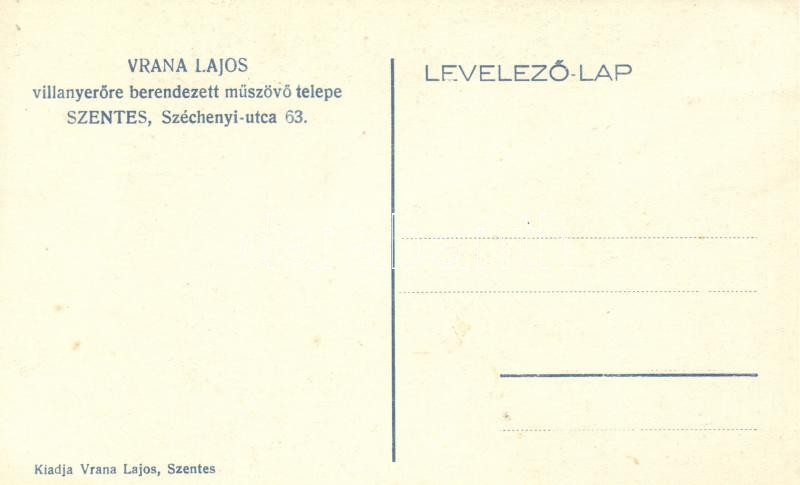 Szentes, Vrana Lajos villanyerőre berendezett műszövő telepe, Szécheny... https://www.darabanth.com/de/19-Gross-Auktion/19.1/Ansichtskarten-Ungarn/Ungarn~6543/Szentes-Vrana-Lajos-villanyerore-berendezett-muszovo-telepe-Szechenyi-utca-63~II929766