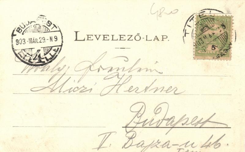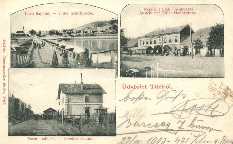 Beschreibung: Titel, Vasútállomás, hajóhíd, fő utca az Anker szállodával / railway station, pontoon bridge, hotel on main street