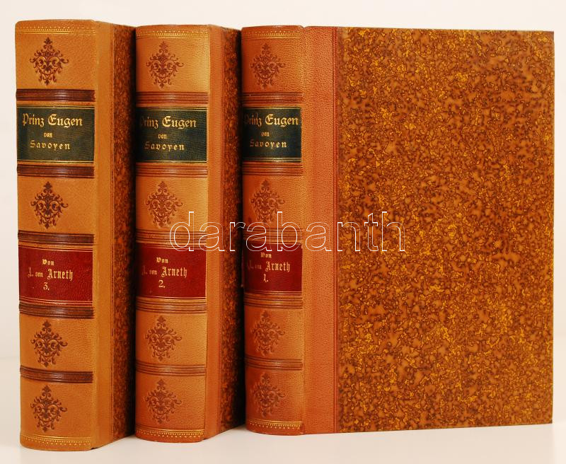 Alfred Arneth: Prinz Eugen von Savoyen. Nach den handschriftlichen Quellen der kaiserlichen Archive. I.-III. Wien, 1858. Verlag der typogr.-literar.-artist. Anstalt. 23 egész oldalas, illetve kihajtható acélmetszettel. Korabeli félbőr kötésben. Nagyon szép állapotban. / In half leather binding, in nice condition. With 23 steel engravings. Full pages.
