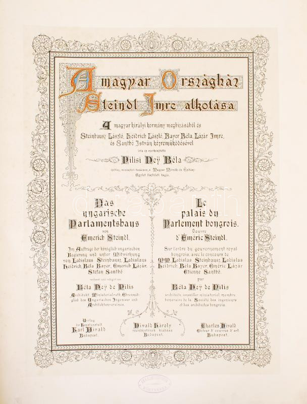 Ney Béla, pilisi: A magyar Országház Steindl Imre alkotása. A magyar királyi kormány megbízásából Steinbausz László, Bayer Béla, Lázár Imre, és Santhó István közreműködésével írta és szerk. - -. Bp. é. n. Divald. 3 sztl. lev. 46 l. 62 t. (e(ebből 52 rézfénymetszet, 4 színezett, 2 kétlapos; 4 színes, 8 kétlapos).