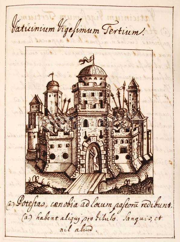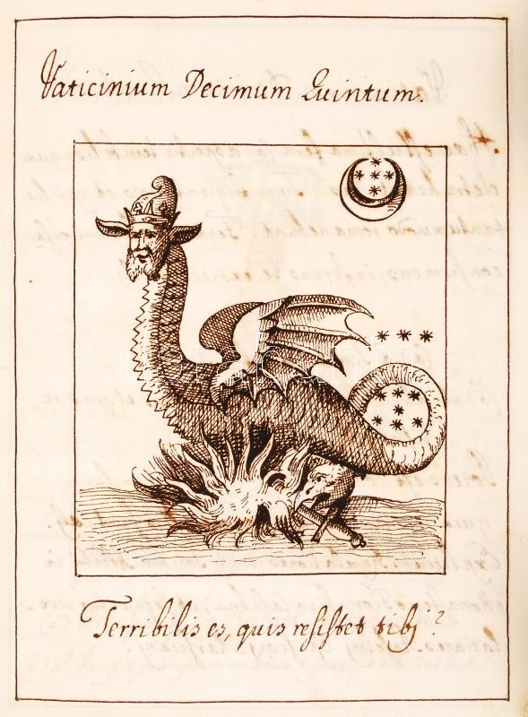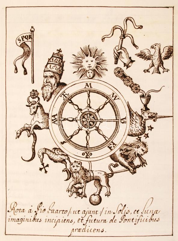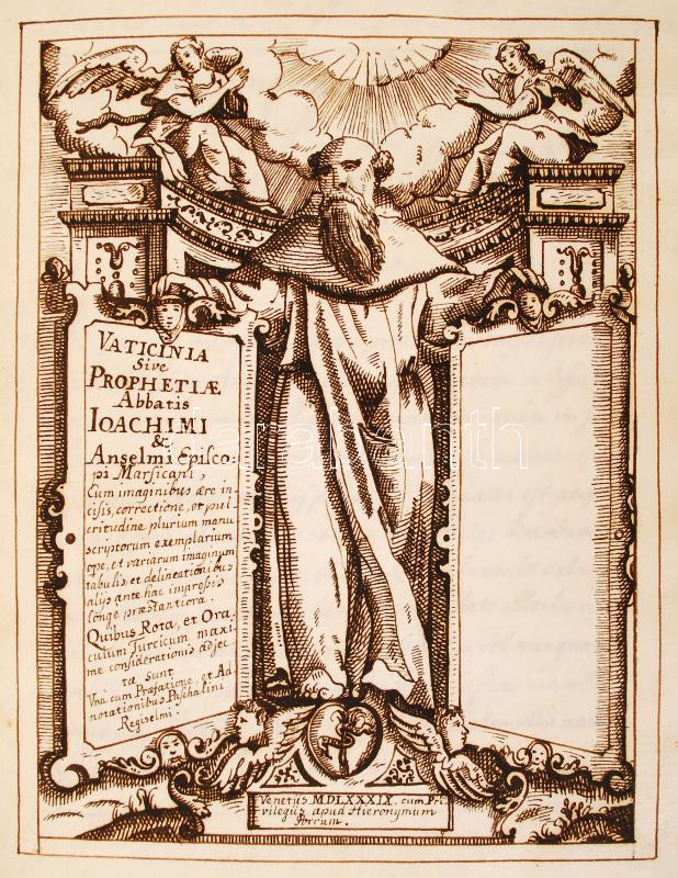 cca 1700 Joachim di Flore - Anselmus Marsicanus: Vaticinia sive prophetiae Abbatis Ioachimi & Anselmi Episcopi Marsicani... c. 1589 ben kiadott könyvének kb 100-150 évvel későbbi kéziratos másolata. A könyv különlegessége a 34 db egész oldalas, aprólékosan kidolgozott rajz, a könyvbeli illusztrációk másolatai. 105 kézzel beírt oldal. Korabeli egészbőr kötésben, gerincén sérüléssel /