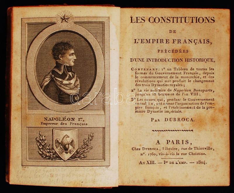 Les Constitutions de L'Empire Francais précédées D'Une Intruduction Historique ... par Dubroca. Paris 1804. 316p. A francia alkotmány. Kissé megviselt egészbőr kötésben / In slightly damaged full leather binding.