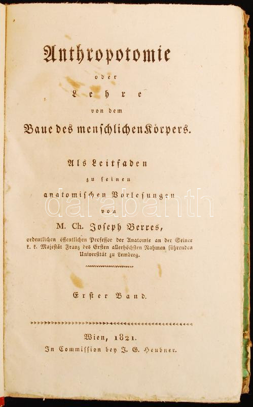 Berres, Joseph: Anthropotomie oder Lehre von dem Baue des menschlichen Körpers. 1. köt. Bécs, 1821, J. G. Heubner. Kartonált papírkötésben, a borító kicsit kopott, egyébként jó állapotban. /