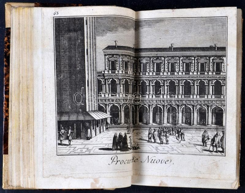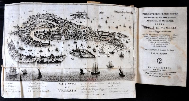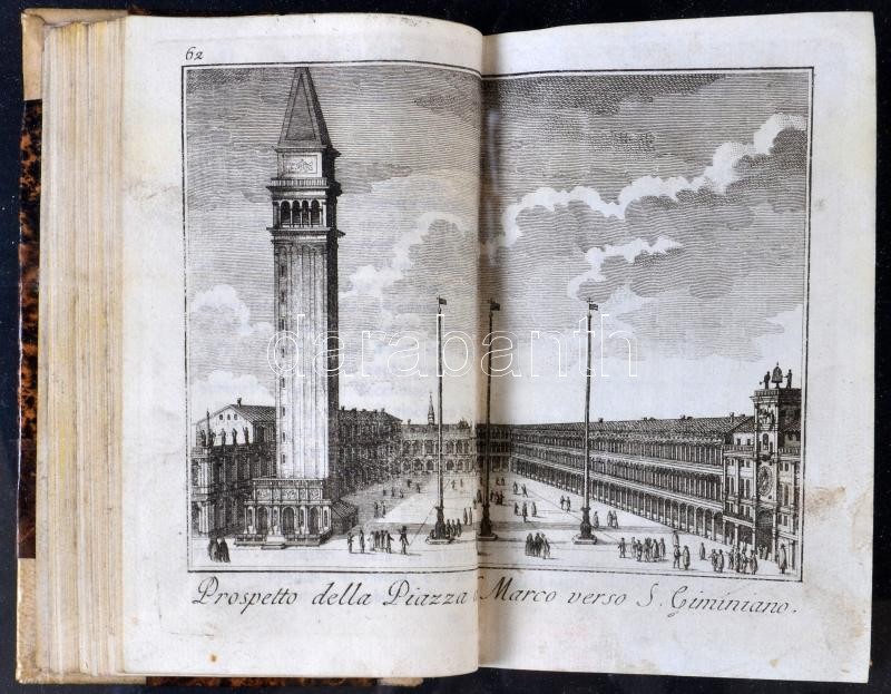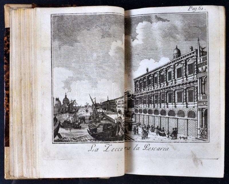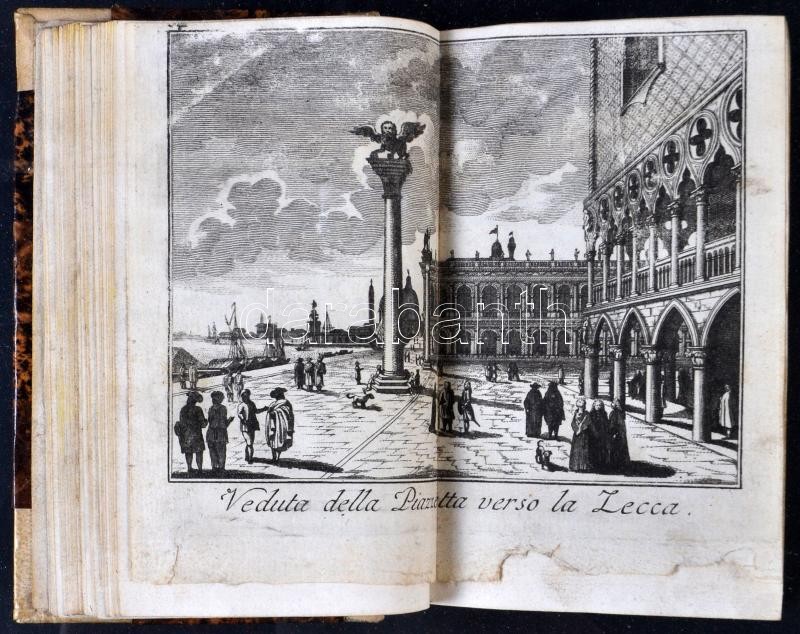 Albrizzi, Giovanni Battista: Forestiero illuminato intorno le cose più rare, e curiose, antiche, e moderne della città di Venezia, e dell'isole circonvicine : con la descrizione delle chiese, monisteri, ospedali, tesoro di S. Marco, arsenale, fabbriche pubbliche, pitture celebri, funzioni e divertimenti, e di quanto v'è di più riguardevole : opera adornata di vedute in rame I.-II. Venezia, 1792. Giacomo Storti. 15 metszettel és 2 kihajtható térképpel. Félbőr kötésben. Szép állapotúű velencei útikönyv / with 15 etchings and 2 etched fold-out maps. In half-leather binding, in nice condition
