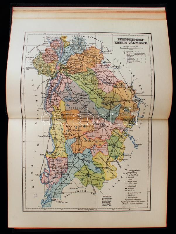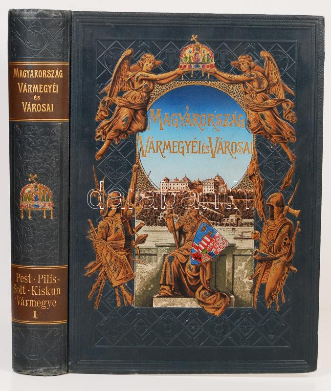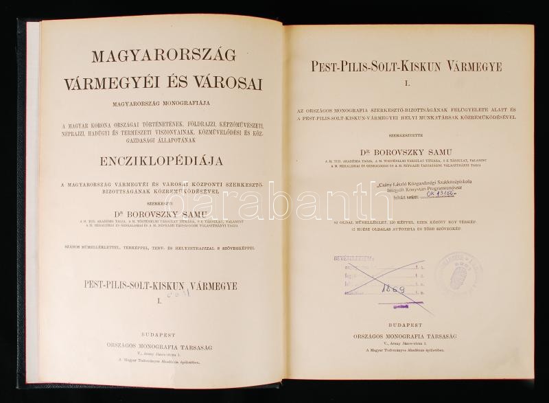 Dr. Borovszky Samu(szerk.): Magyarország vármegyéi és városai, Magyarország monográfiája. Pest-Pilis-Solt-Kiskun vármegye I. 92 oldal műmelléklet, 320 képpel, ezek között egy térkép. 12 egész oldalas autotipia és több szövegkép. Bp., Országos Monografia Társaság. Kiadói aranyozott, festett, dombornyomott egészvászon kötés, színezett lapszélek, gerincnél enyhén kopott, belső borítólapja kissé szakadt, enyhén kopottas állapotban.