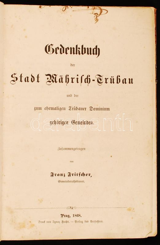 Franz Fritscher: Gedenkbuch der Stadt Mährisch Trübau und den zum ehemaligen Mähr. Trübauer Dominium gehörigen Gemeinden, Prag, 1868. Ignaz Fuchs. 201p.