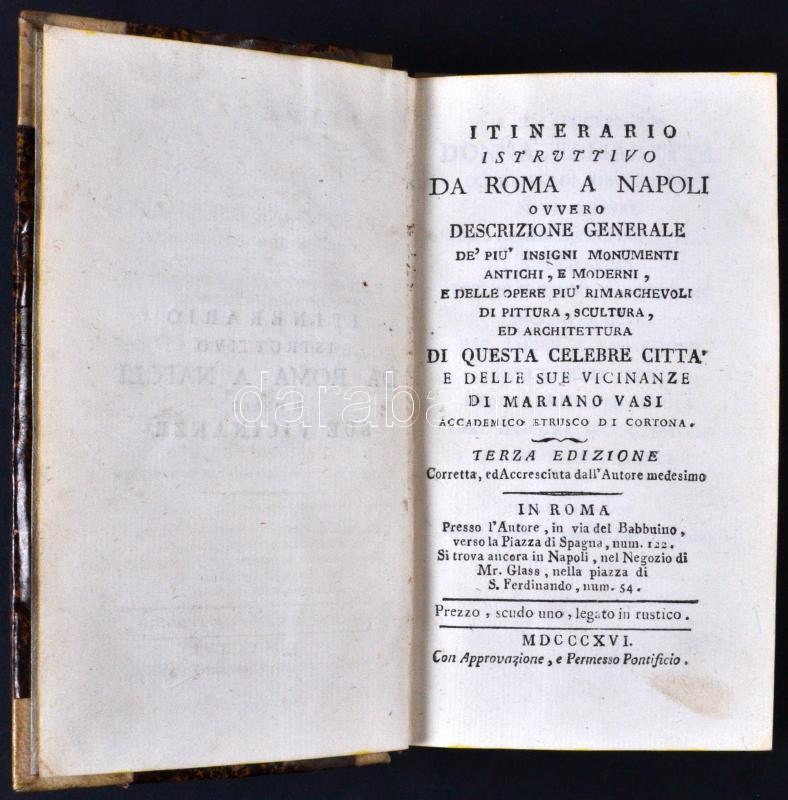 Itinerario istruttivo da Roma a Napoli ovvero descrizione generale de' piu' insigni ... ed architettura di questa celebre città e delle sue vicinanze Rom, 1816. Pressol'autore. 33 metszettel és két metszett, kihajtható térképpel, jó állapotú félbőr kötésben / With complete 33 etchings and two etched fold-out maps. In half leather binding, in nice condition