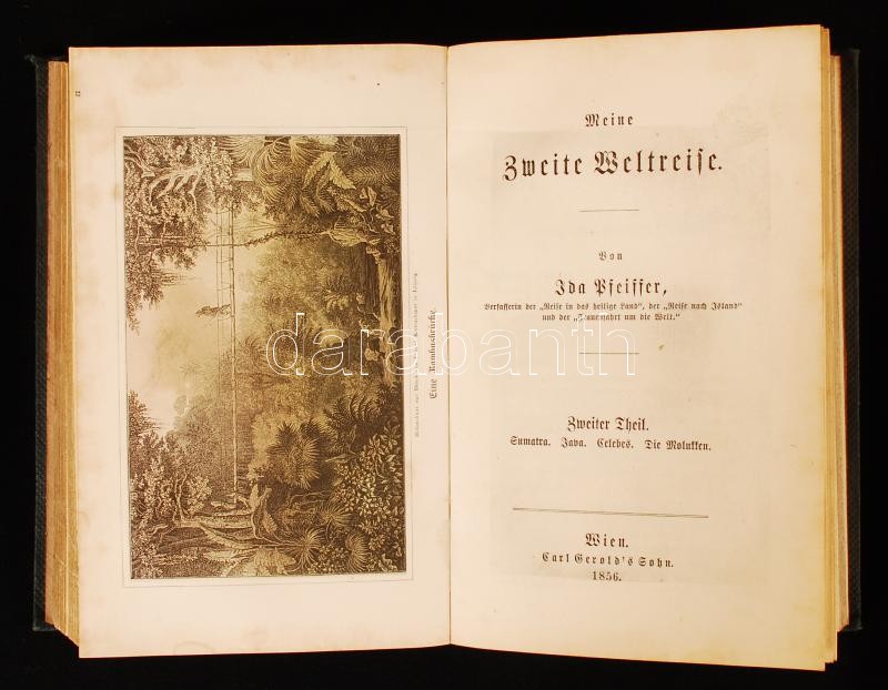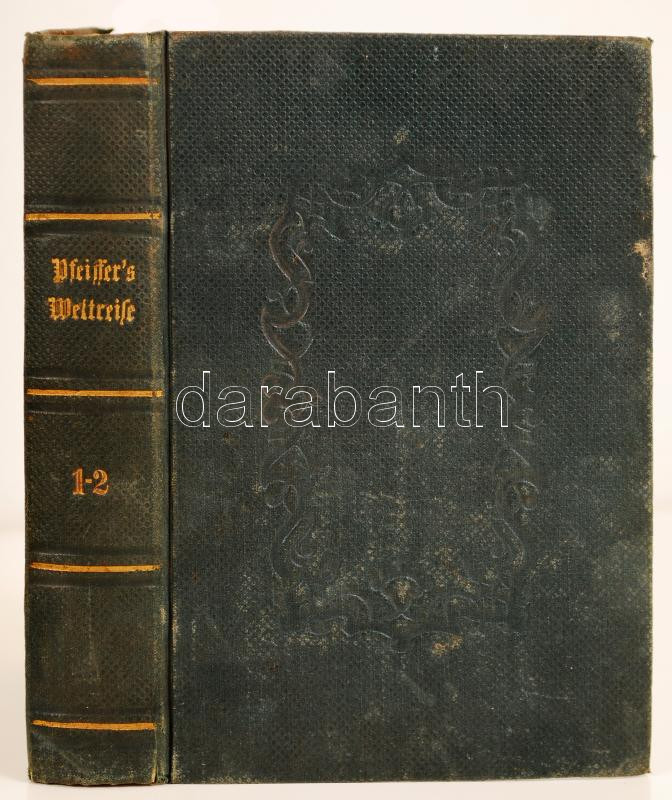 Pfeiffer, Ida: Meine zweite Weltreise. 1-4. Teil. Két kötetben. 4 fametszettel / In 2 volumes with 4 wood engravings. Wien, 1856. Carl Gerold's Sohn. Belül kissé elvált egészvászon kötésben / In full linen binding, slightly parted inside.
