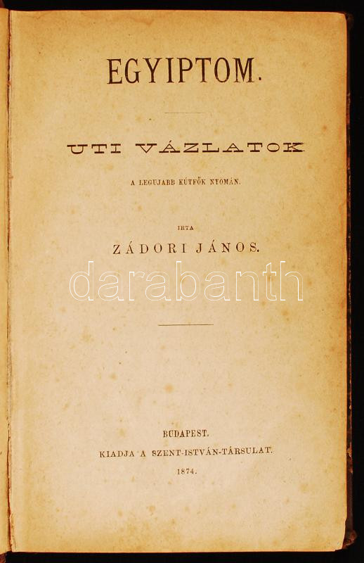Zádori János: Egyiptom. Uti vázlatok a legujabb kútfők nyomán. Bp., 1874. Szent-István Társ. X+(2)+259p. Félvászon kötésben
