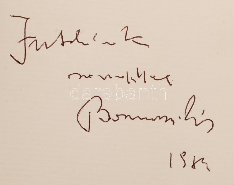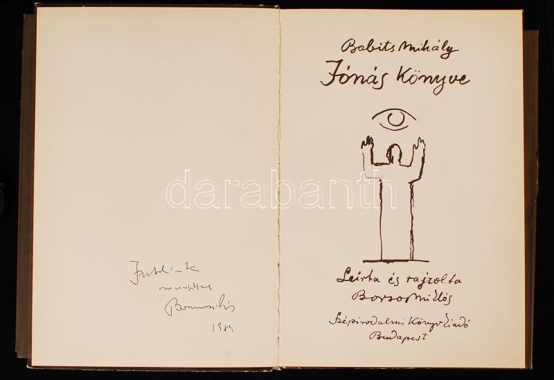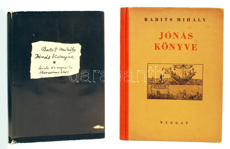 2 db könyv: Babits Mihály: Jónás könyve. [Bp.], [1939], Nyugat, elsÅ‘ kiadás. Készült 1000 számozott példányban, 866. sorszámozott példány, Babits Mihály aláÃrásával. Félvászon kötésben, jó állapotban; Babits Mihály: Jónás könyve. LeÃrta és rajzolta Borsos Miklós. Bp., 1974, Szépirodalmi Könyvkiadó. Borsos Miklós (1906-1990) szobrász, grafikus dedikációjával. Kicsit kopott kartonált papÃrkötésben, műanyag védÅ‘borÃtóval, jó állapotban.