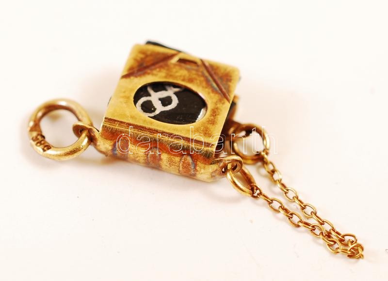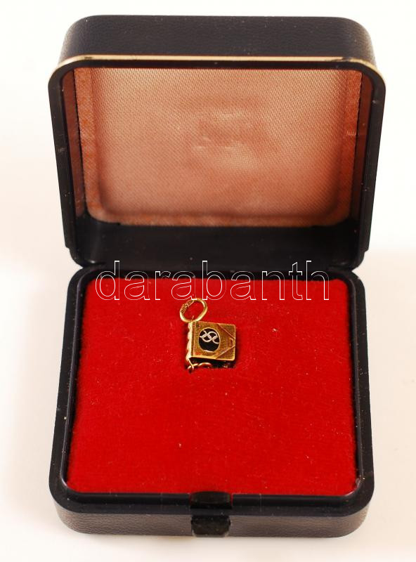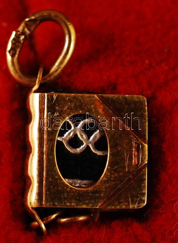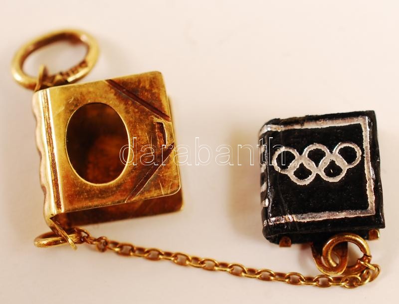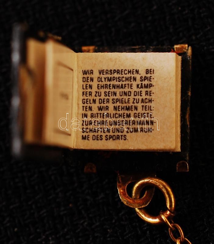 Olimpia mikrokönyv, olimpiai eskü szövegével, díszdobozban, aranyozott fém tartóban, rajta 14K arany karikával 6 mm / Micro book with the Olympic oath in many languages in gold plated metal case, on gold ring 6 mm in special case