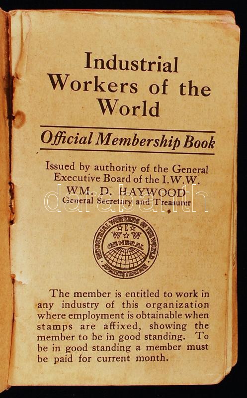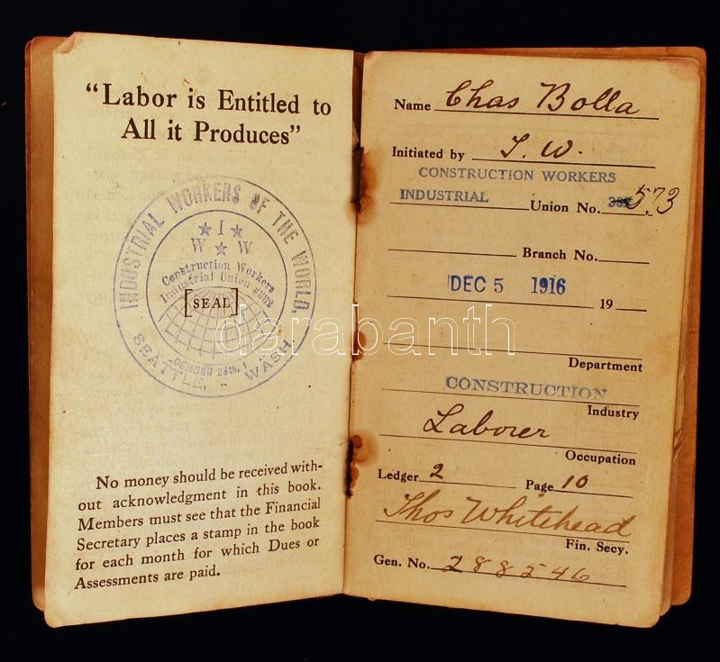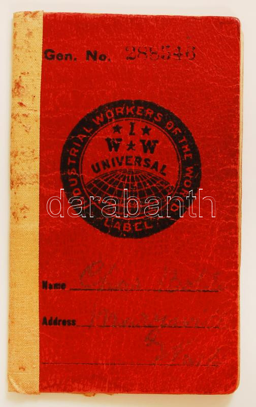 1916 Ipari Dolgozók Világszövetsége tagsági könyv bélyeggekkel. Magyar személy részére. Kissé megviselt állapotban / Industrial Workers of the World membership booklet with stamps. Worn condition