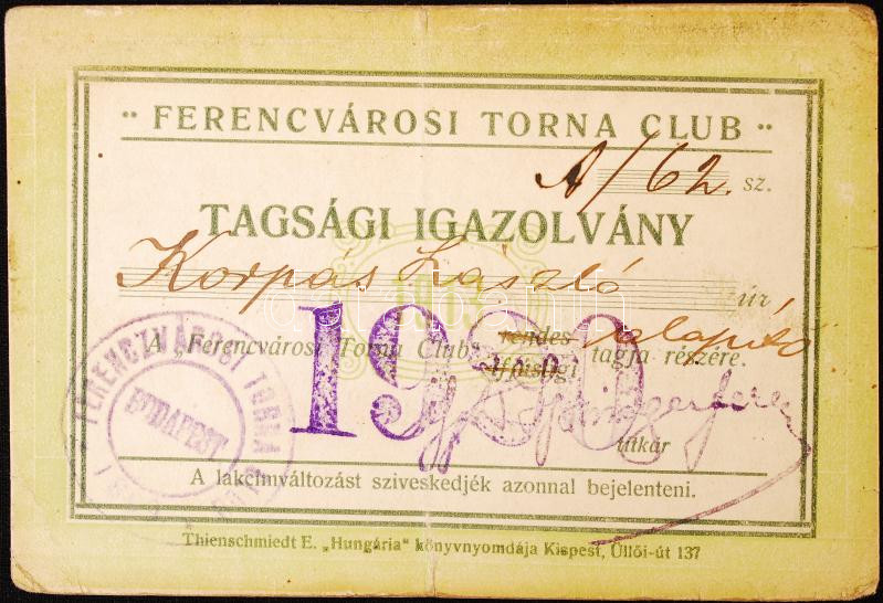 1920 Ferencvárosi Torna Club (Fradi) igazolványa Korpás László alapító... https://www.darabanth.com/de/19-Gross-Auktion/19.1/Kunst-Dokumente/Dokument~6533/1920-Ferencvarosi-Torna-Club-Fradi-igazolvanya-Korpas-Laszlo-alapito-reszere~II933859