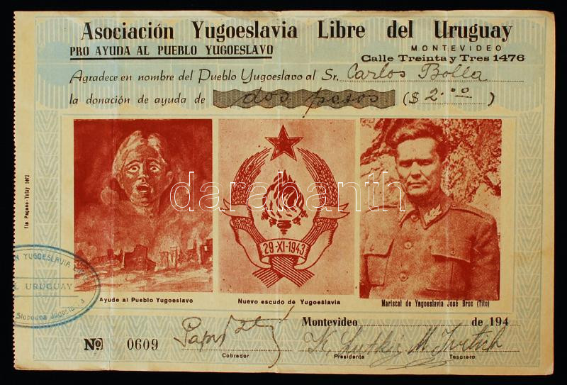 1943 Az Uruguayi Szabad Jugoszlávia Szövetség adománygyűjtő íve. Sorsz... https://www.darabanth.com/de/19-Gross-Auktion/19.1/Kunst-Dokumente/Dokument~6533/1943-Az-Uruguayi-Szabad-Jugoszlavia-Szovetseg-adomanygyujto-ive-Sorszamozott-1943-Uruguay~II911583