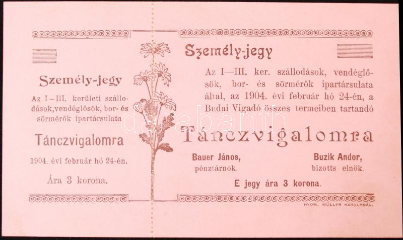 1904 Személy jegy táncvigalomra az I.-III. kerületi szálodások, vendég... https://www.darabanth.com/de/19-Gross-Auktion/19.1/Kunst-Dokumente/Drucksachen~6485/1904-Szemely-jegy-tancvigalomra-az-I-III-keruleti-szalodasok-vendeglosok-bor-es-sormC3~II933832