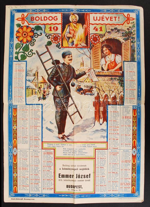 1941 Kéményseprő falinaptár Emmer József Bp., II. Jó állapotban. / Chi... https://www.darabanth.com/de/19-Gross-Auktion/19.1/Kunst-Dokumente/Drucksachen~6485/1941-Kemenysepro-falinaptar-Emmer-Jozsef-Bp-II-Jo-allapotban-Chimneysweep-calendar-34x2~II894225