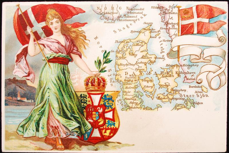 cca 1900 Dánia térképe és címerének lithografált képe. Földes Kelemen aradi gyógyszerész reklámkártyája / cca 1900 Denmark litho advertising on the backside Arad pharmacist commercial 13x9 cm