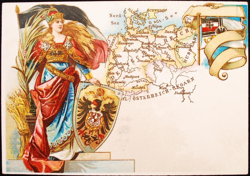 cca 1900 Németország térképe és címerének lithografált képe. Földes Kelemen aradi gyógyszerész reklámkártyája / cca 1900 Germany litho advertising on the backside Arad pharmacist commercial 13x9 cm