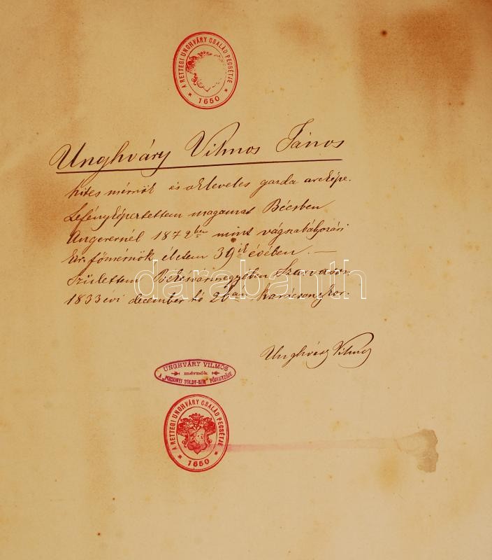1872 Angerer (Bécs): Unghváry Vilmos János (Szarvas, 1833-1902) mérnök és okleveles gazda portréja, feliratozott, 45x33 cm (ilyen nagy méretben az 1870-es évek elejéről ritkán bukkan fel hiteles fénykép, érdemes megnézni)