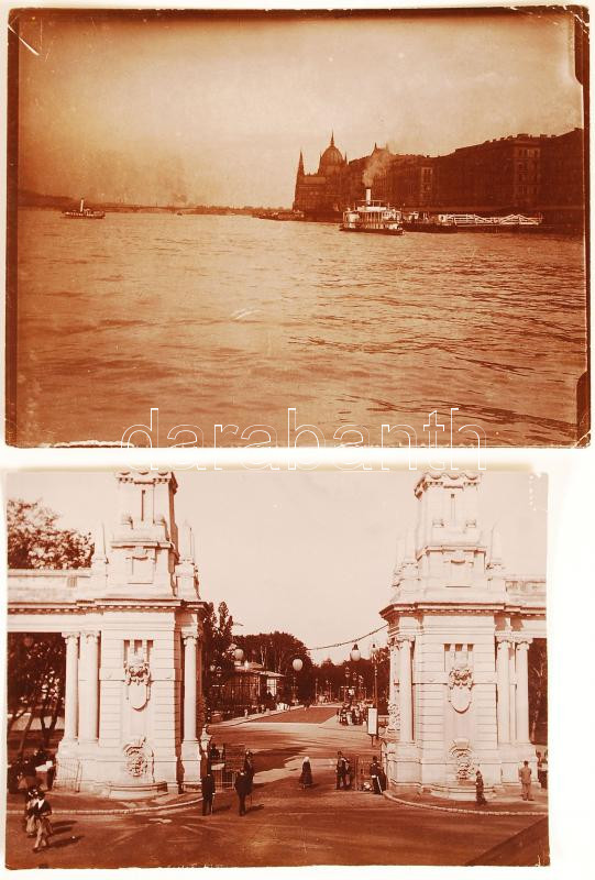 Beschreibung: 1896 Budapest, Városliget, a Millenniumi kiállítás bejárata és a Dunán közlekedő lapátos gőzhajó 8x11 és 9x12 cm
