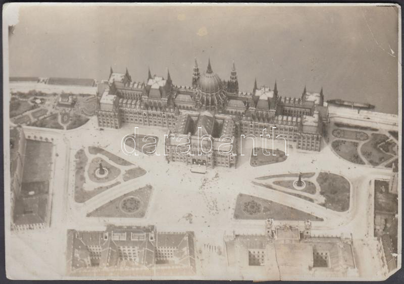 Beschreibung: 1919. május 1. Budapest, az Országház tér, előtte a proletárőrök szobrai, légi fotó, feliratozva, képszéli szakadások, törések javítva, 16x11 cm