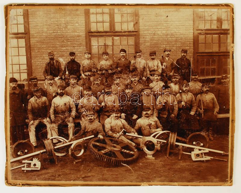 cca 1910 Gépgyári munkások csoportképe szerszámokkal, termékekkel, fel... https://www.darabanth.com/de/19-Gross-Auktion/19.1/Kunst-Dokumente/Foto~6534/cca-1910-Gepgyari-munkasok-csoportkepe-szerszamokkal-termekekkel-feluleten-kopasnyomok-2~II925645