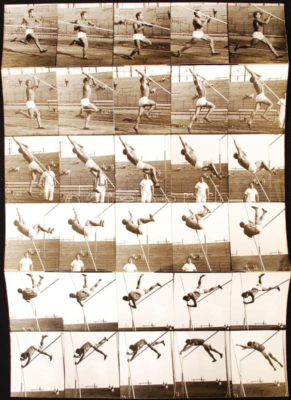cca 1935-1940 Kozák Lajos: Rúdugró, a sportoló mozgásáról készített fázisfotók, 30 db felvétel, 3 fotópapíron, 34x24 cm /