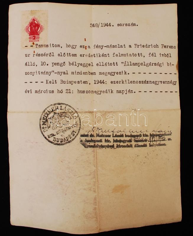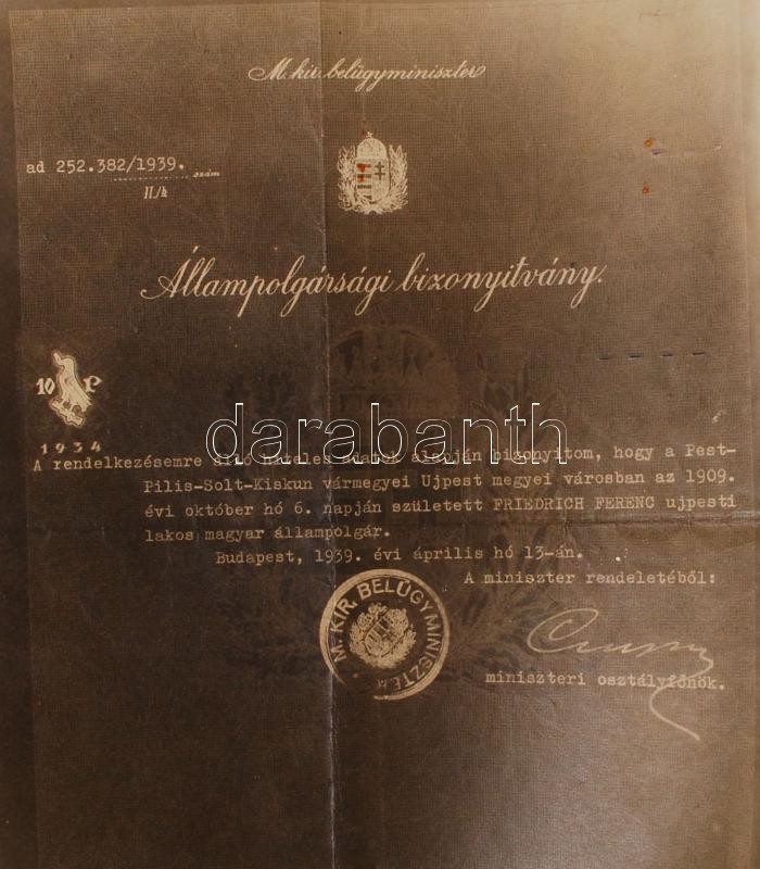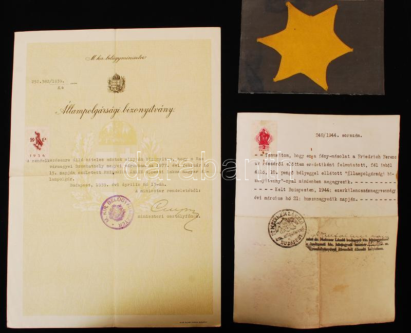 1944 Izraelita személy részére kiállított állampolgársági bizonyítvány és igazolás, valamint textil sárga csillag / Citizenship document and yellow star