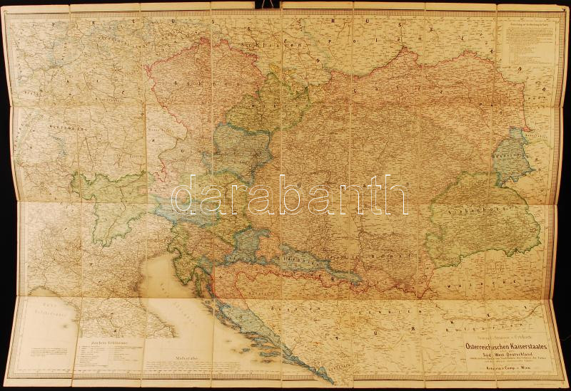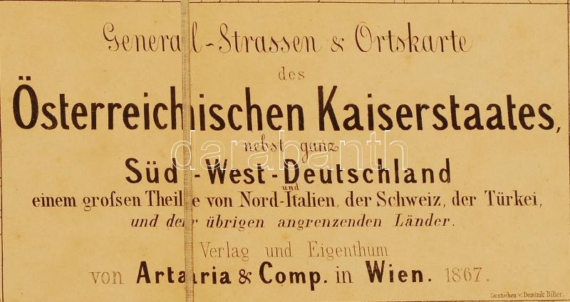 1867 Az Osztrák-Magyar Monarchia térképe. General Strassen und Orstkarte des Österreichischen Kaiserstaates. Artaria & Comp. Wien. Vászon térkép eredeti borítóval és tokkal, jó állapotban / Map of the Austro-Hungarian Monarchy on canvas in original case. In nice condition. 80x100 cm
