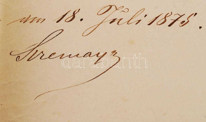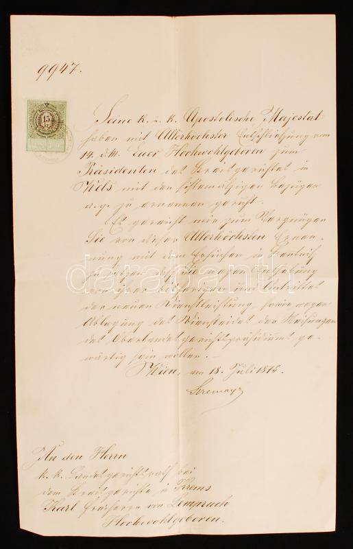 1876 Karl Freiherr von Lempruch osztrák tábornok polgári kinevezési okmánya Kremayr igazságügyminiszter saját kezű aláírásával / Announcing document of Karl Freiherr von Lempruch with autograph signature of Kremayr minister of Justice