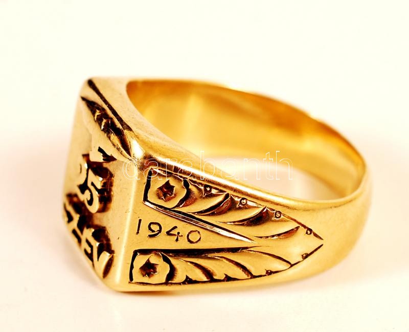 1940 Légierő repülős emlékgyűrü 25 SZ-ÉV 1915-1940 felirattal. Jelzett 14 K arany. / 1940 Hungarian air-force military mermorial ring for 25 years of service. 14 carat gold. 21,3g
